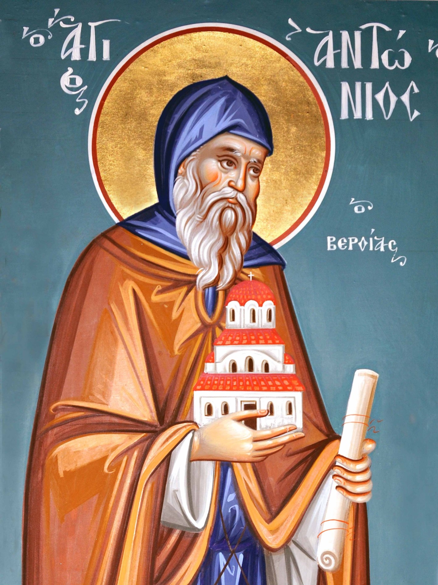 Μέγα καύχημα, καὶ πολιοῦχον, σὲ πλουτίσασα πόλις Βεροίας, θεοφόρε παμμάκαρ Ἀντώνιε, τῇ σῇ πρεσβείᾳ προστρέχει ἑκάστοτε, προσπτυσσομένη τὴν πάντιμον κάραν σου. Πάτερ ὅσιε, Χριστὸν τὸν Θεὸν ἱκέτευε, δωρήσασθαι ἡμῖν τὸ μέγα ἔλεος.